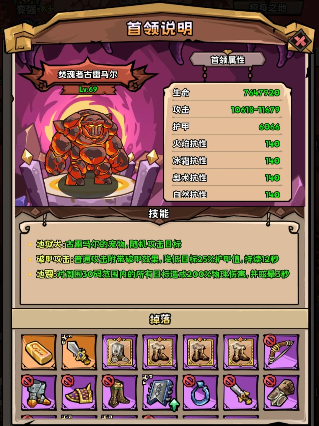技能一:地狱犬,进入战斗BOSS靠近玩家后,召唤一只地狱犬,伤害较高,地狱犬血量低于20%会自爆,跟小石头自爆一样。