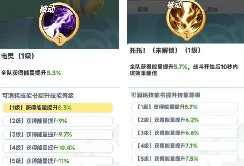 电羊初始被动全队获得能量提升8.3%,满级12.4%;而托托初始被动全队获得能量提升5.7%,满级才达到8.5%,满级几乎与电羊初始被动持平。