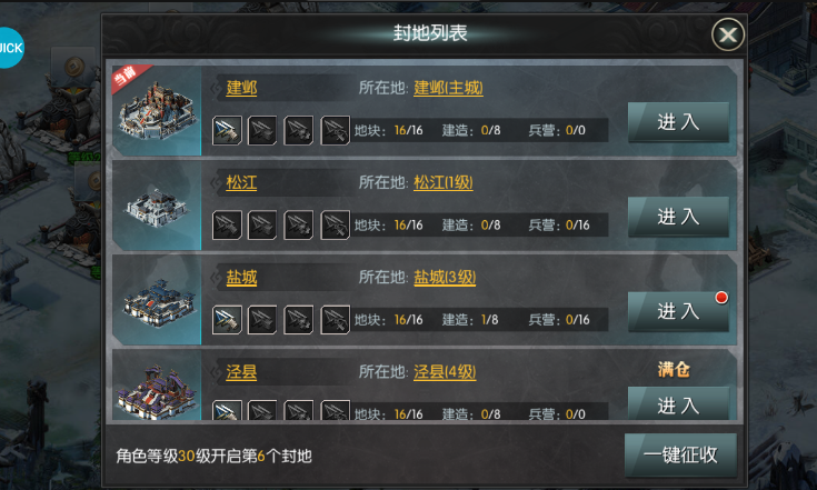 农场,木厂,铜矿建筑等级越高产量与储存上线越高,兵营需要升级才能招募到更高级的兵力,封地是在世界上面的城池上面封的,城池等级越高对封地建筑的提升越高。封地每五级开启一个新的封地。