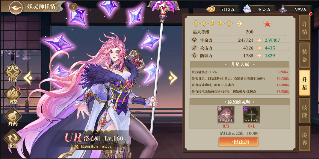 升星可以提高英雄的各项初始属性,每次升星需要消耗不同条件升星材料,升星达到指定星级后还可额外解锁该妖灵师独有的升星天赋。已经满星或溢出的妖灵师可通过招募——遣散功能进行遣散,再用获得的时空残卷到秘宝轩的兑换商店中兑换自己所需要的妖灵师。