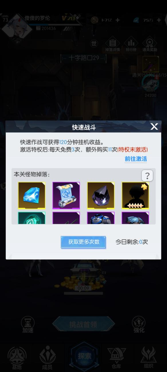 通过精神力点数提升冒险家等级,通过探索通关主线关卡、挂机两个方式获取,所以前期尽可能去通关主线关卡,挂机除了时间挂机还可点击快速战斗获取120分钟挂机效益,开通特权可增加次数;