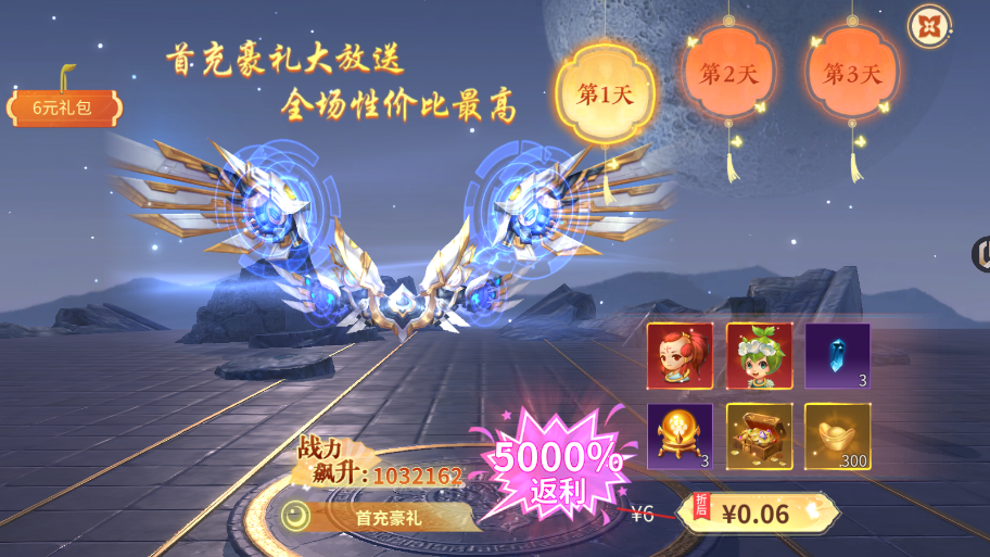 1、首充送超绝神翼,首冲只需0.06!战力直线飙升!