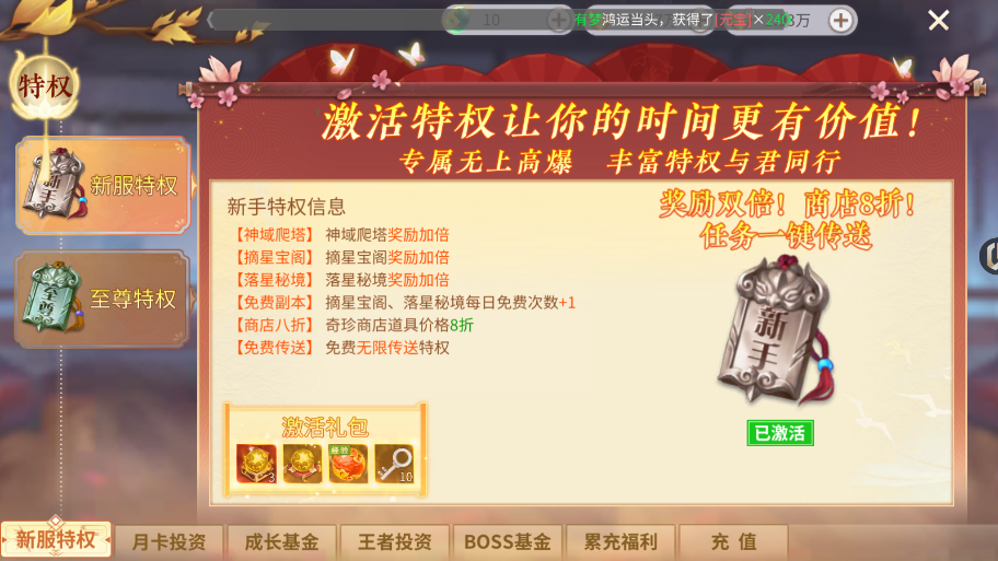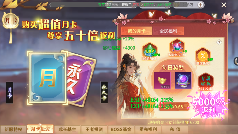 2、超值月卡永久卡微氪党必备,性价比极高,新服特权,提升战力快人一步!