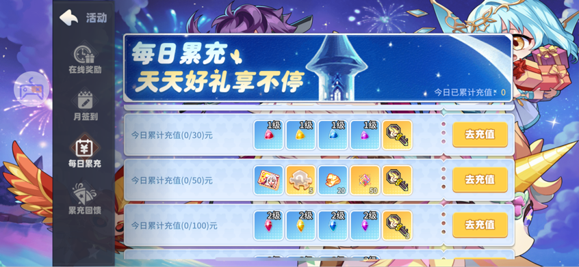 每日累充中,不同档次都会送星座钥匙,每一把钥匙可以挑战一次。
