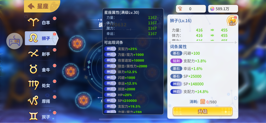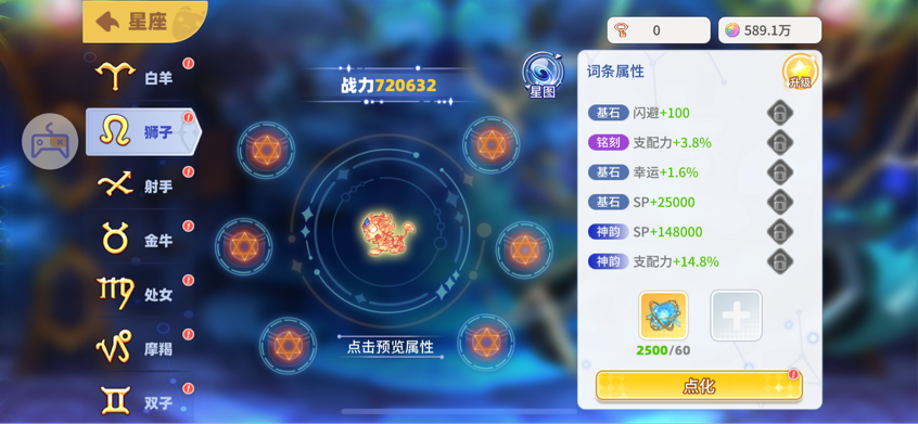 点化建议大家星座等级到15级了再去点化,这样比较节省星象秘语哦!同时每个星座的第一个词条就是最好的属性词条,如果大家点化到了就可以及时收手咯(大佬忽略)