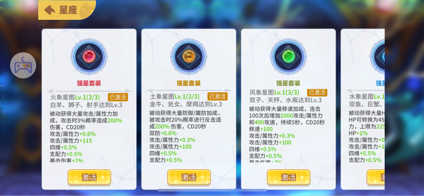 同时星座玩法还有星图一个很重要的提升方面。每个象限的三个星座同时达到3级,6级,9级,12级,15级,18级,21级,24级,27级,30级后可以激活获得额外属性加成。