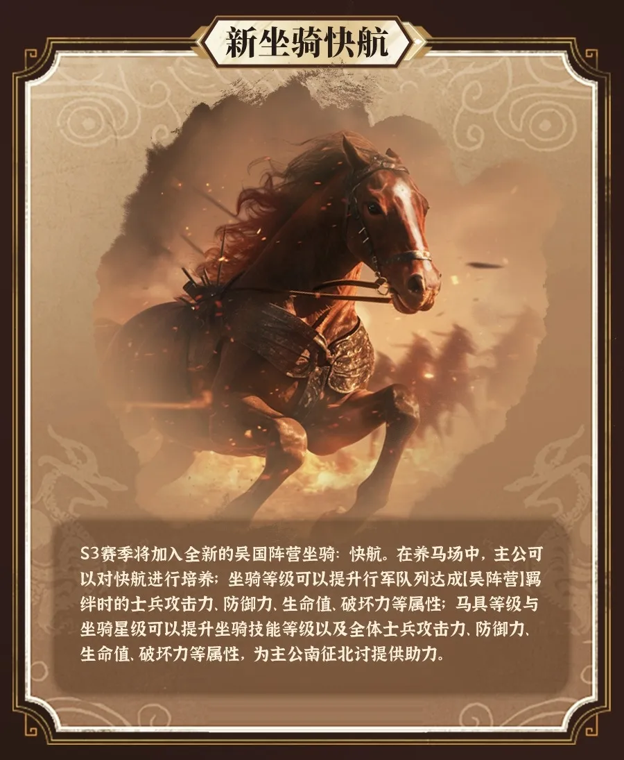 ※三赛季的城主碎片为孙权,二赛季坐骑没有满星的玩家可以争一下孙权的排名拿碎片,因为到了三赛季的卢碎片满了之后需要买快航,普通玩家只需要拿个本体开荒就好,主吴队伍的玩家可以着重提升一下。